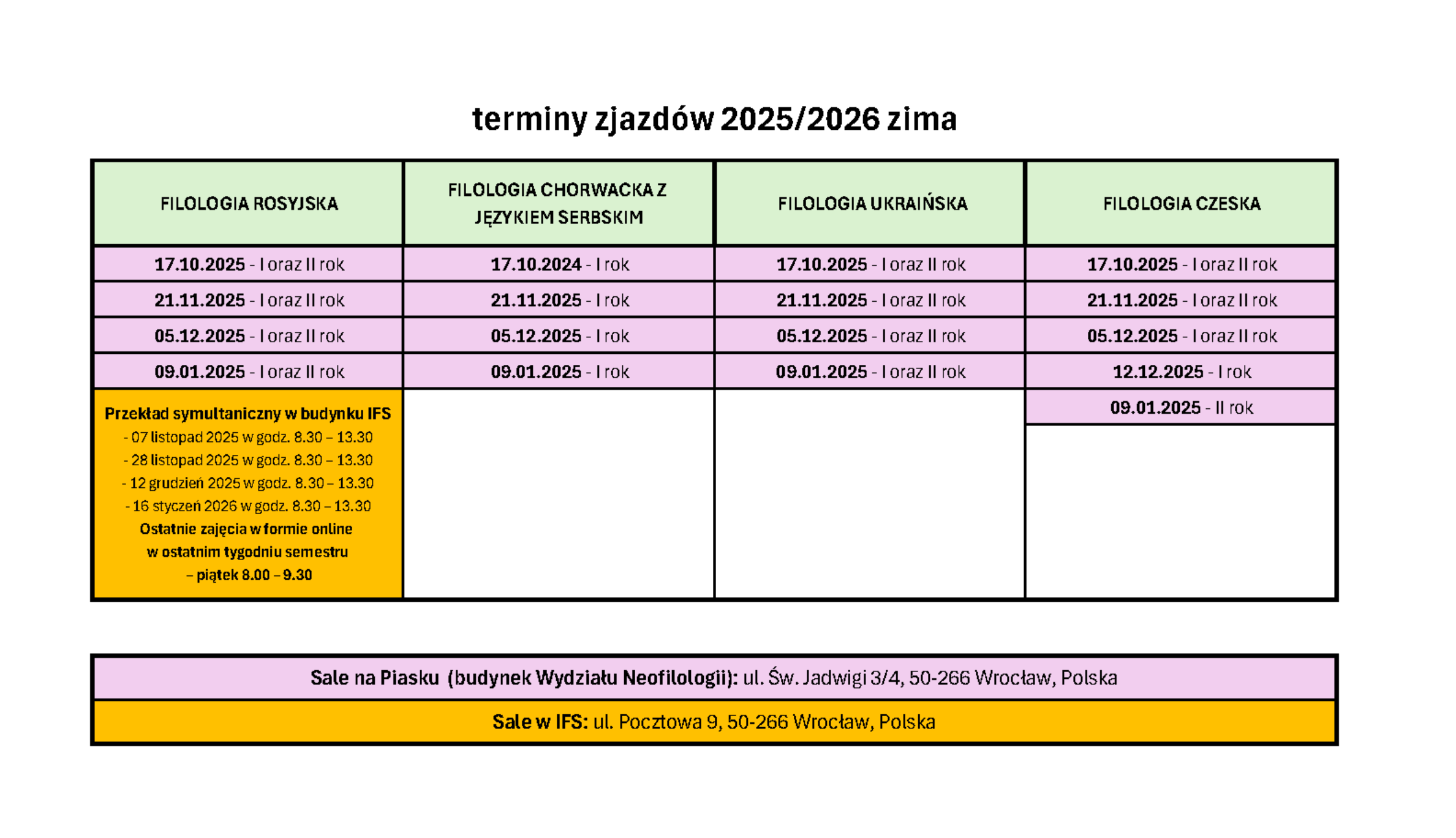 Harmonogram zjazdów w semestrze zimowym dla slawistów