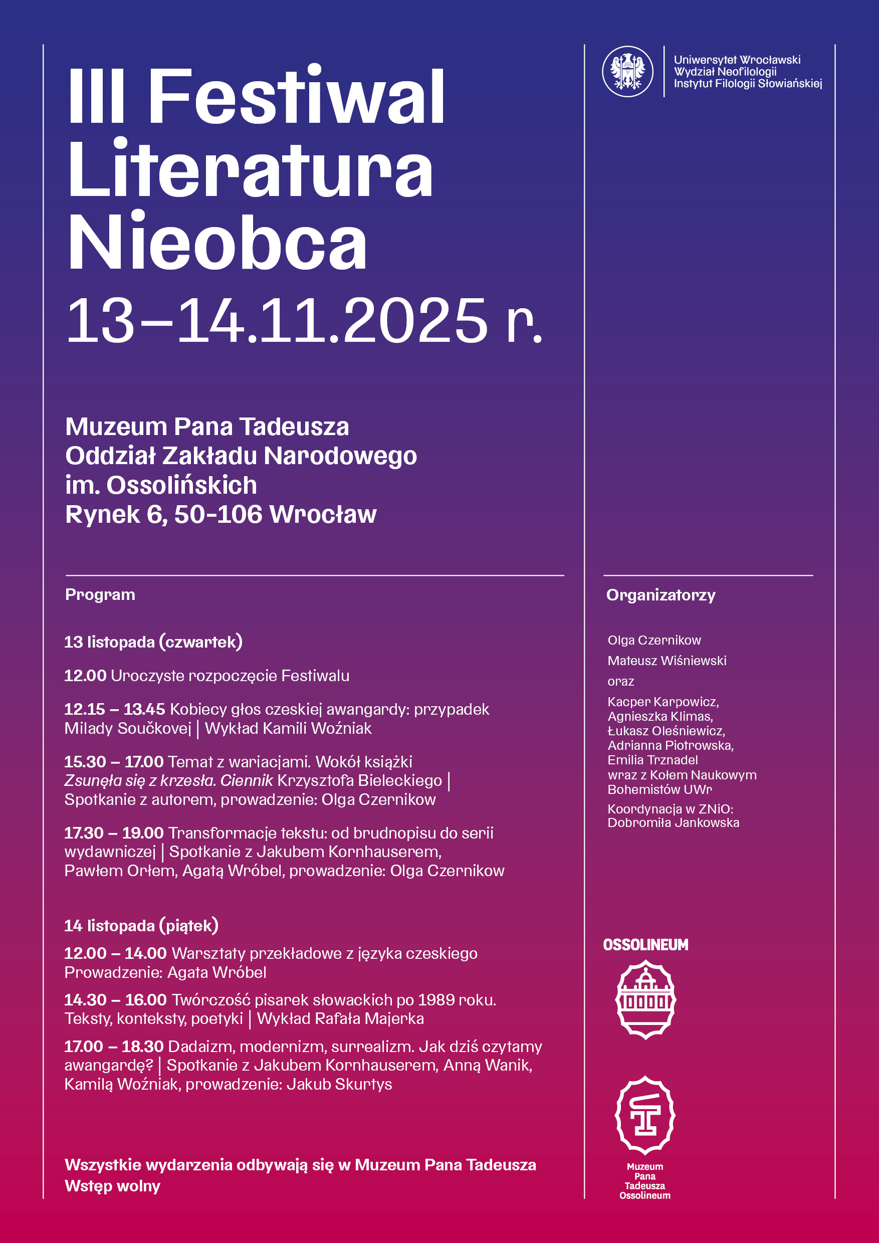 Dzisiaj rozpoczyna się III Festiwal Literatura Nieobca, organizowany wspólnie z Muzeum Pana Tadeusza przez dr Olgę Czernikow z Zakładu Bohemistyki, przy współpracy dr Mateusza Wiśniewskiego oraz Koła Naukowego Bohemistów.